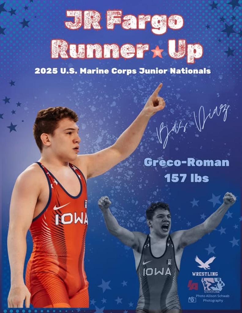Bas Diaz, earned his second All-American status in Greco-Roman Wrestling at the Junior National Championships. Diaz took 5th in 2024 and was a national finalist at 157lbs in 2025.